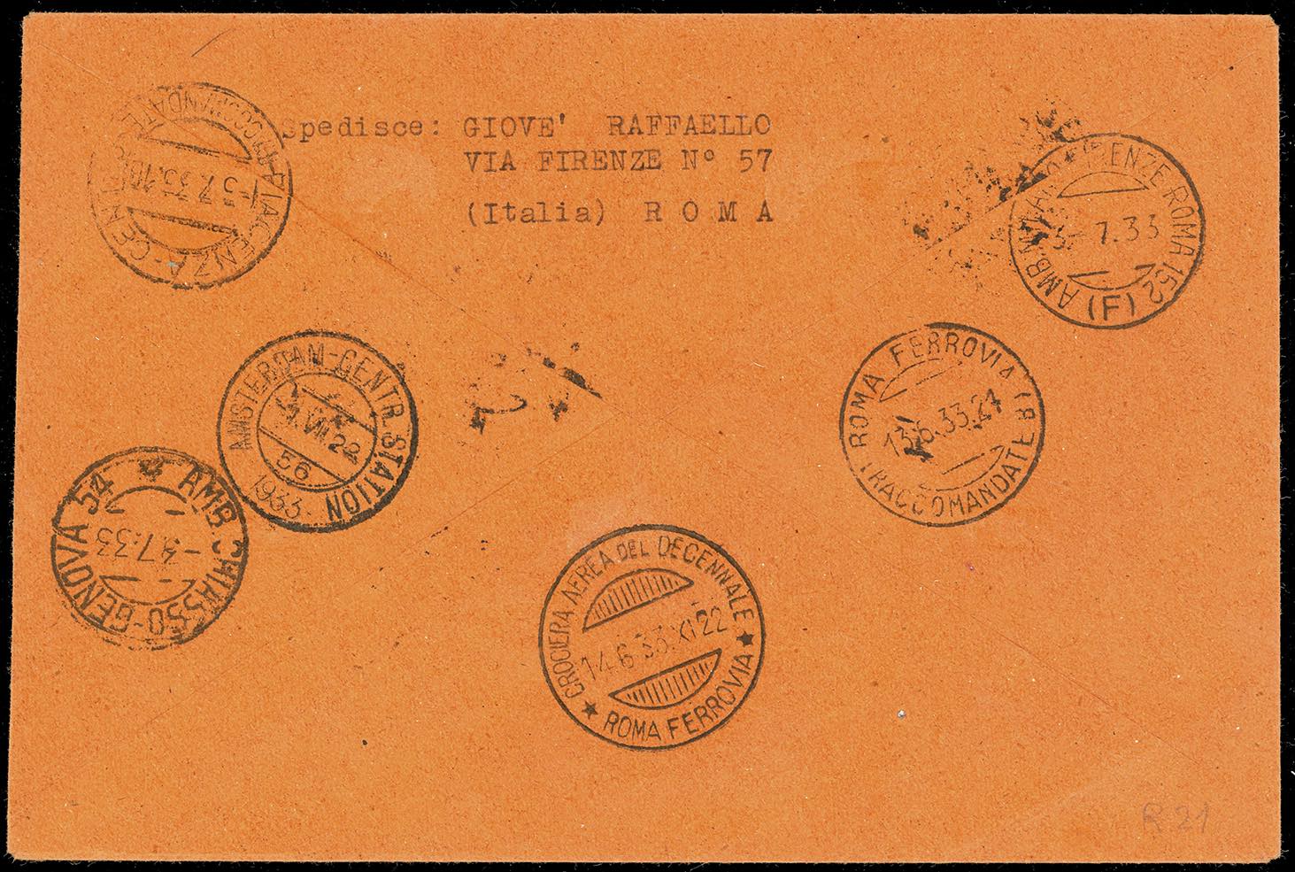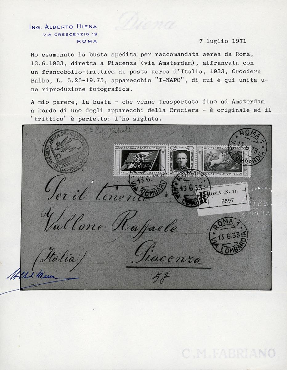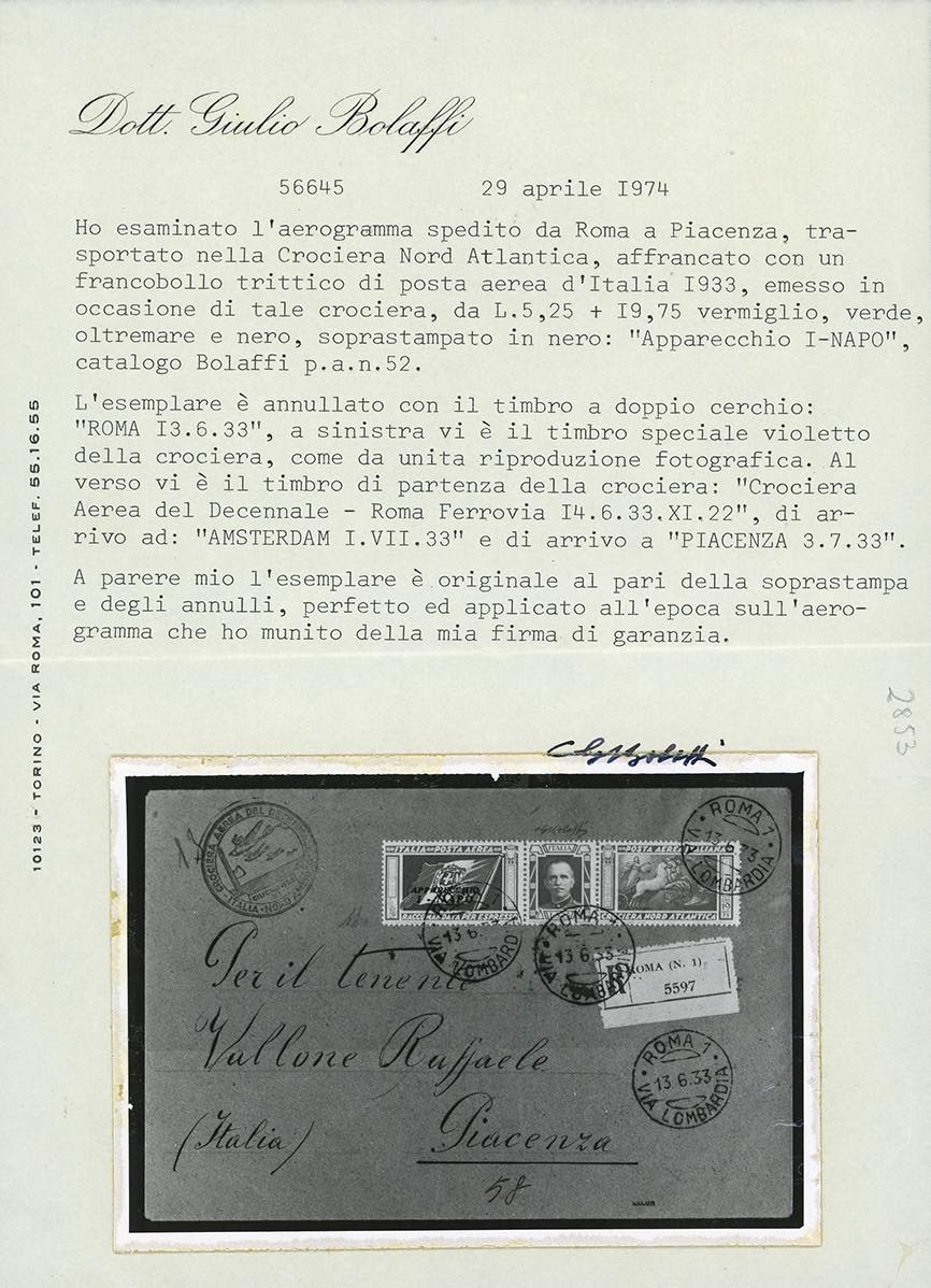 1933 - 5,25 + 19,25 lire Trittico I-NAPO (51M), perfetto, su aerogramma raccomandato da Roma 13/6/1933 a Piacenza, viaggiato fino ad Amsterdam, durante la Crociera Nord Atlantica, con bolli speciali. Molto bello e insolita busta arancione. Cert. Alberto Diena e Giulio Bolaffi.