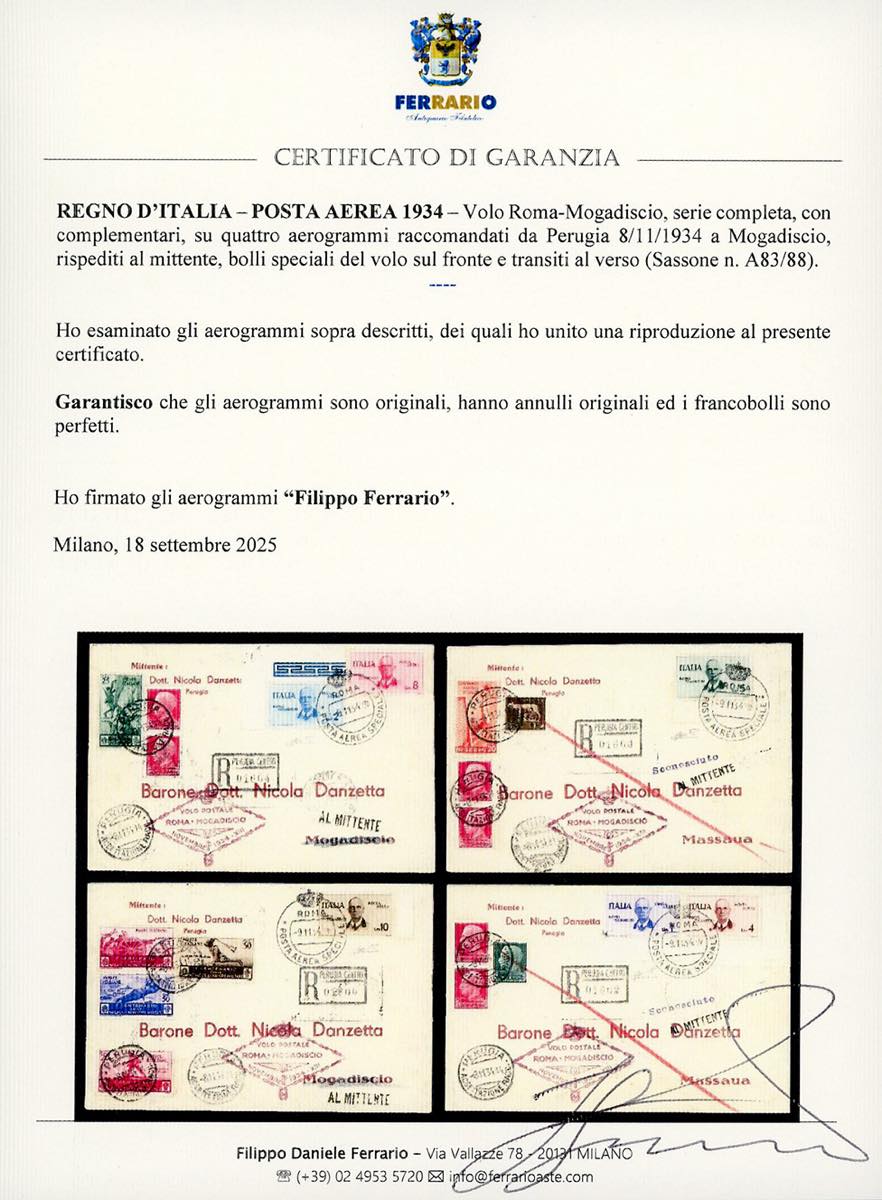 1934 - Volo Roma-Mogadiscio, serie completa (83/88), con complementari, su quattro aerogrammi raccomandati da Perugia 8/11/1934 a Mogadiscio, rispediti al mittente, bolli speciali del volo sul fronte e transiti al verso. Insieme non comune. Cert. Ferrario.