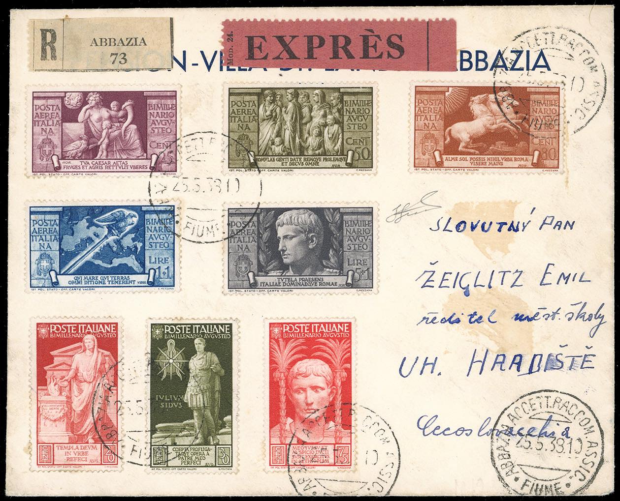 1938 - Augusto, serie completa con complementari di posta ordinaria (A106/A109,418,420,422), perfetti, su busta raccomandata espresso da Fiume 25/5/1938 per la Cecoslovacchia, bolli di transito al verso. Ferrario.