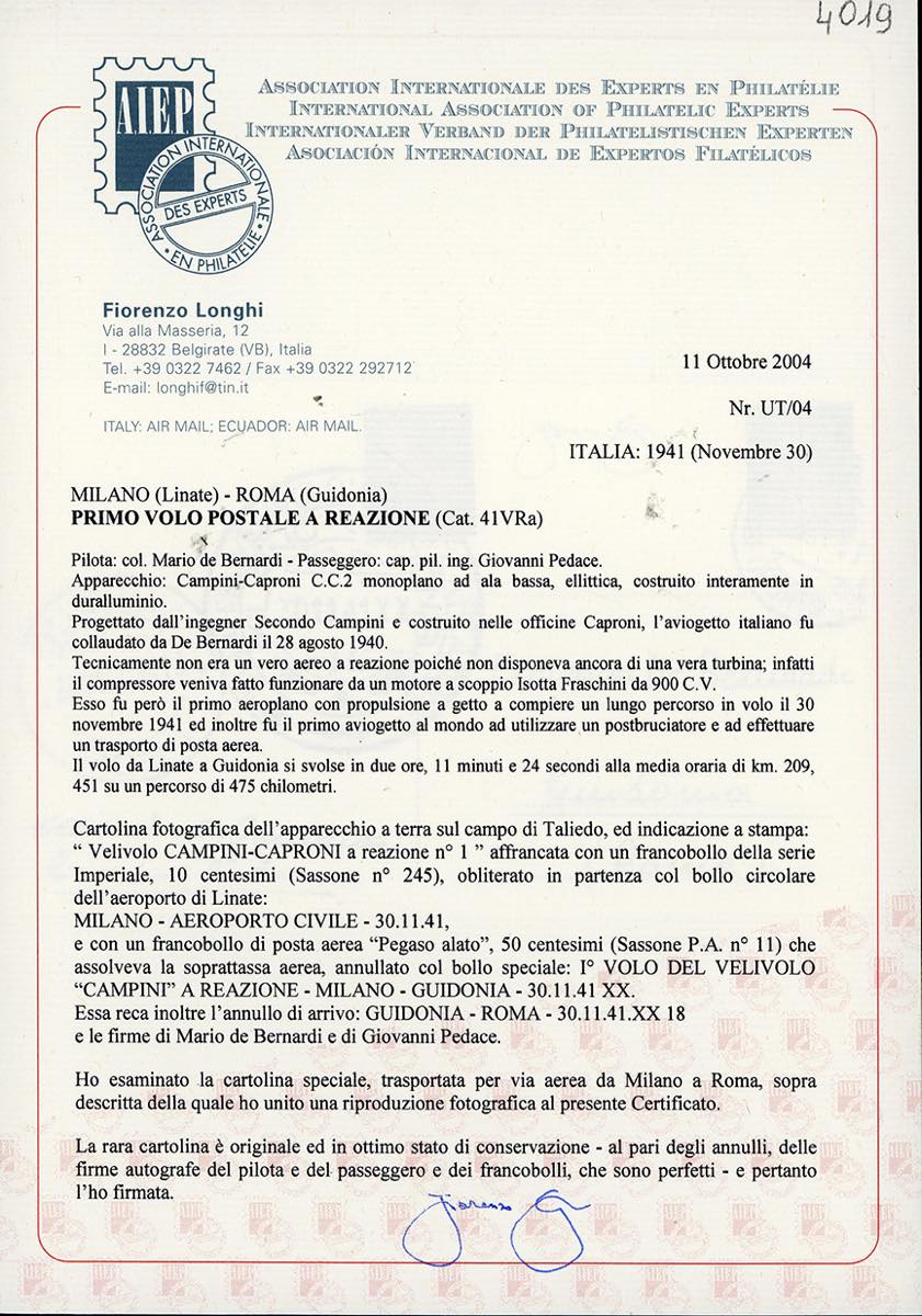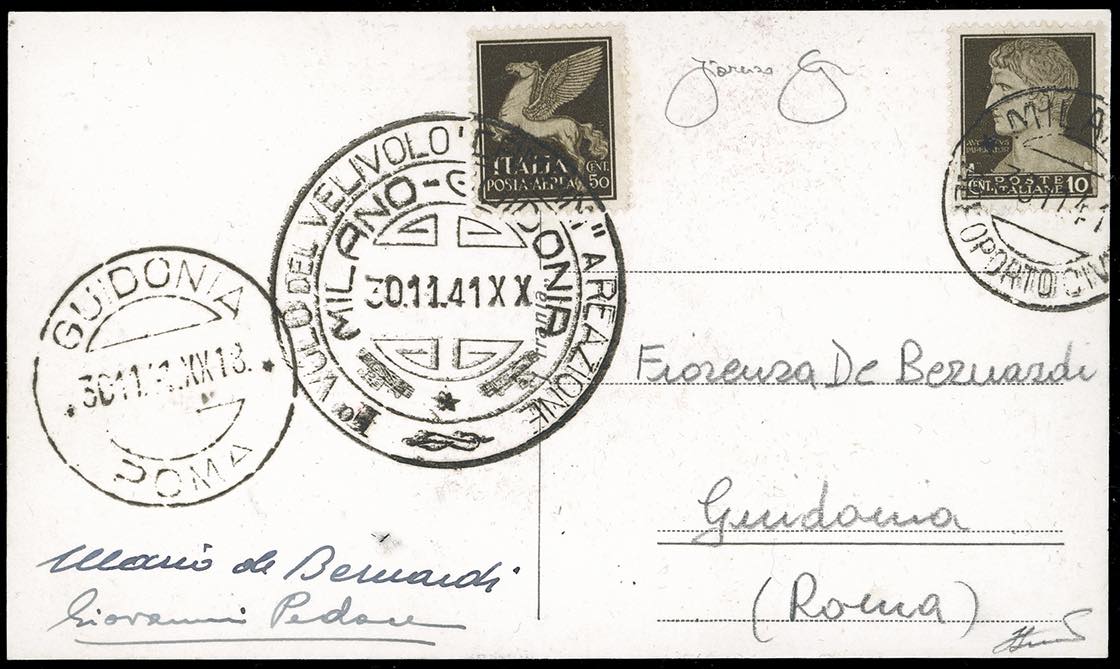 1941 - CAMPINI CAPRONI - Cartolina fotografica dell'apparecchio sul campo Taliedo a Milano, affrancata con 10 cent. Imperiale e 50 cent. Pegaso di Posta Aerea (245,A11), perfetti, viaggiata da Milano 30/11/1941 a Roma, con bolli speciali e bollo d'arrivo. Reca inoltre le firme di Mario De Bernardi e Giovanni Pedace. Bella e rara. Ferrario, cert. Longhi.