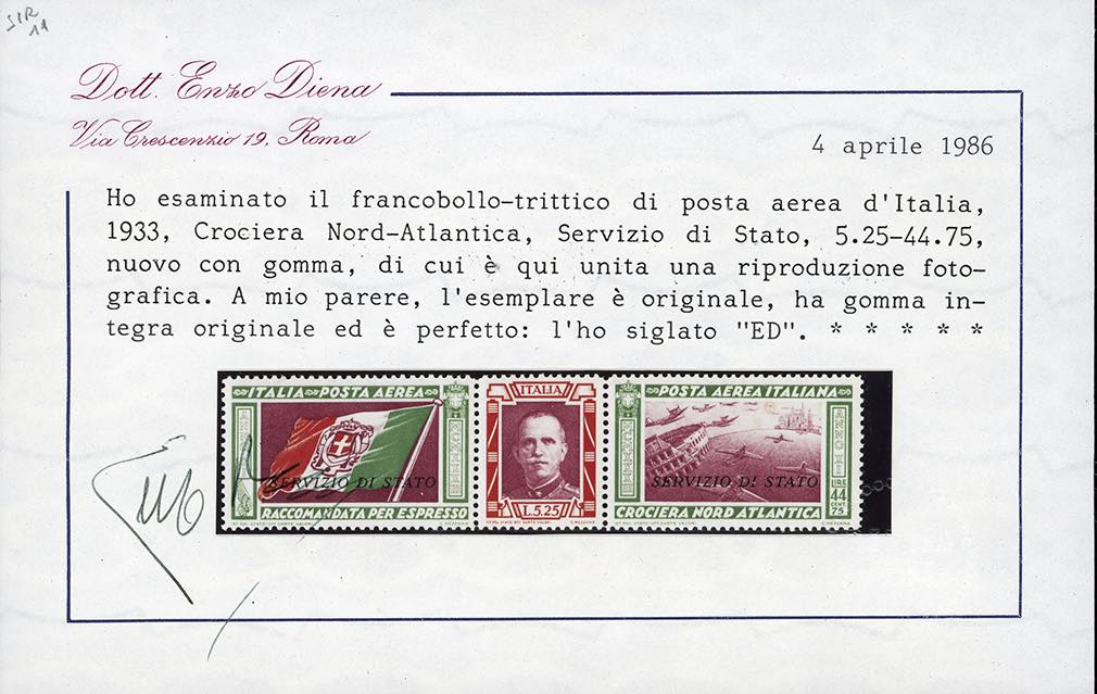 1933 - 5,25 + 44,75 lire Trittico Servizio di Stato (1), nuovo, gomma originale integra, perfetto e ottimamente centrato. Splendido. Firmato Alberto Diena e Renato Mondolfo, cert. Raybaudi ed Enzo Diena 1986.