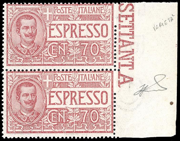 1925 - 70 cent. (11), coppia verticale, entrambi gli esemplari con ampio salto di dentellatura a destra, bordo di foglio, nuova, gomma originale integra, perfetta. Interessante e non comune. Ferrario.