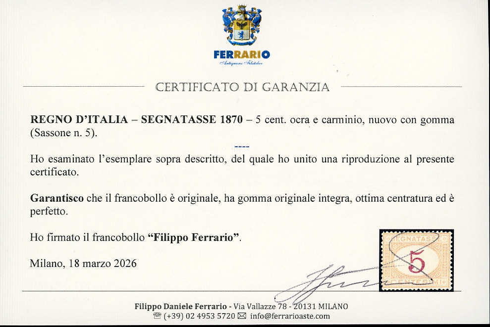 1870 - 5 cent. ocra e carminio (5), ottima centratura, nuovo, gomma originale integra, perfetto. Cert. Ferrario.