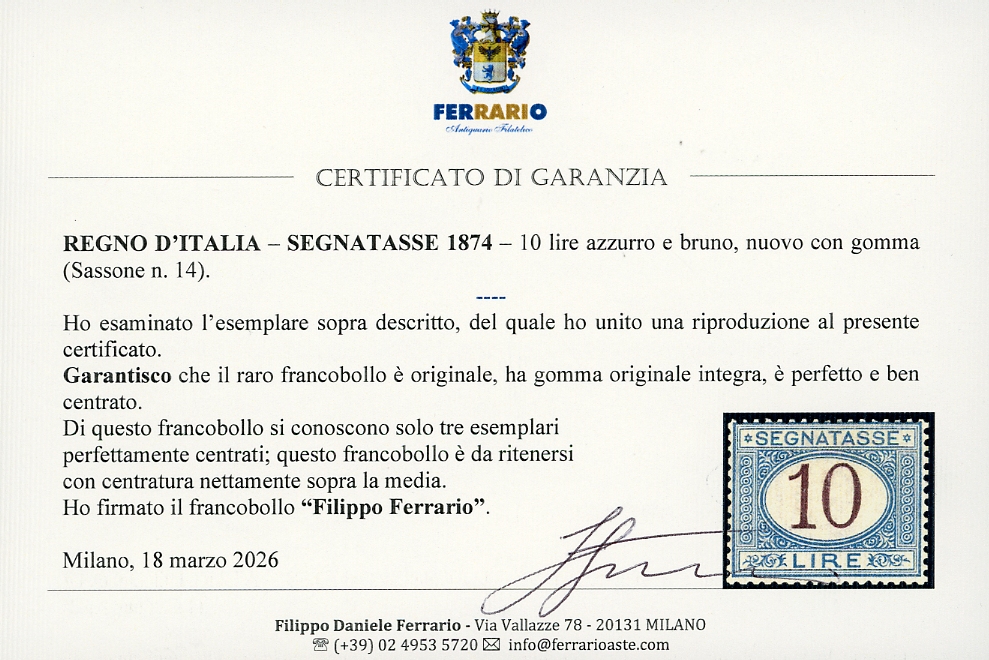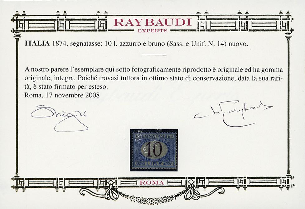 1874 - 10 lire azzurro, cifre brune (14), nuovo, gomma originale integra, perfetto, con centratura quasi ottimale. Di questo francobollo si conoscono solo tre esemplari perfettamente centrati. Questo esemplare è da ritenersi molto raro e nettamente sopra la media. Firmato Alberto Diena, cert. Ferrario e Oro Raybaudi (cat.Sassone € 45.000/100.000).