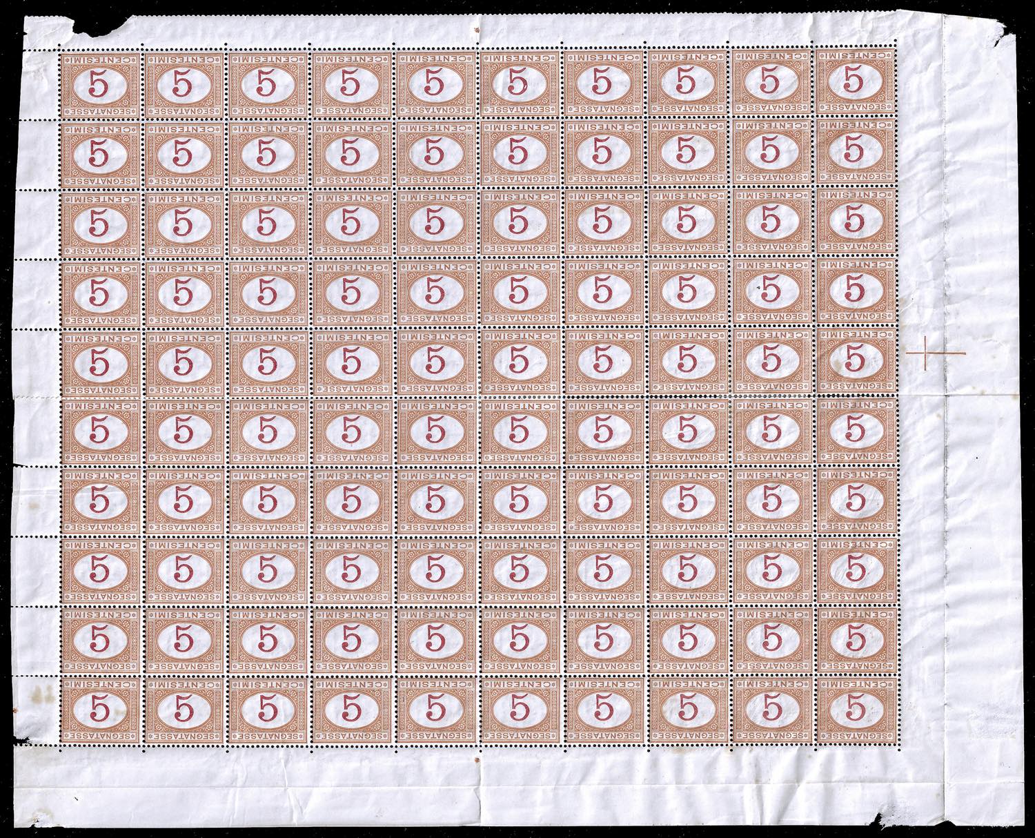 1890 - 5 cent. arancio e carminio, cifra capovolta (20a), foglio completo di 100 esemplari, nuovo, gomma originale integra, perfetto.