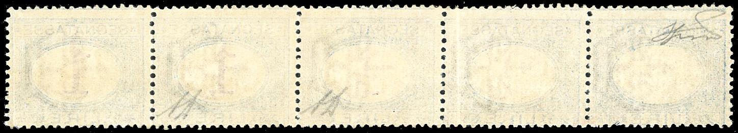 1890 - 1 lira azzurro e carminio, striscia orizzontale di cinque, i primi due esemplari senza la cifra, il terzo con la cifra evanescente, ... Leggi tutto