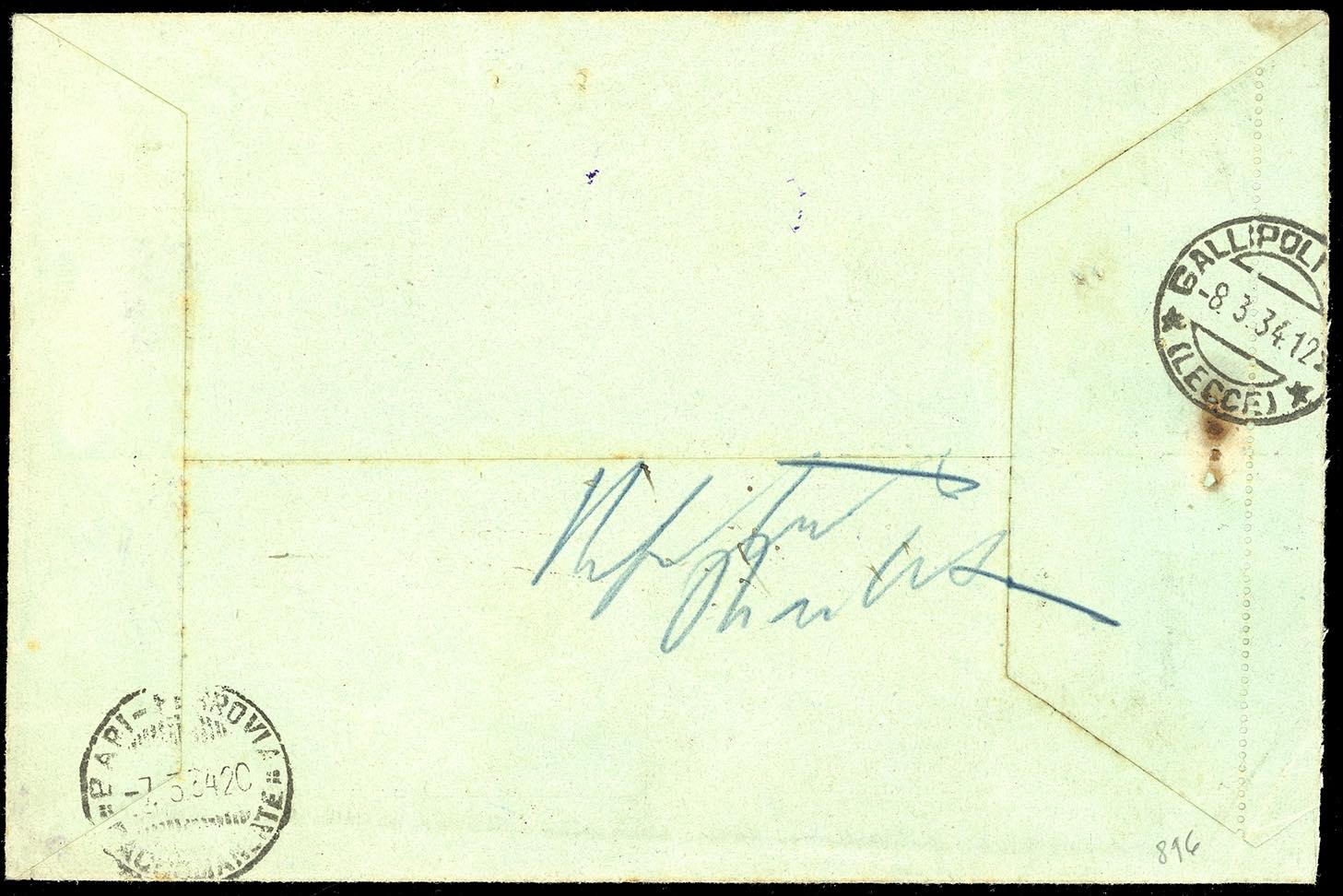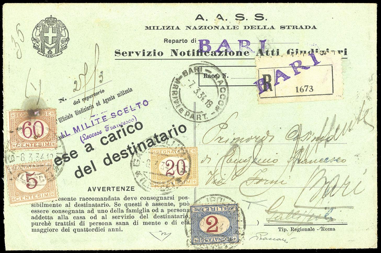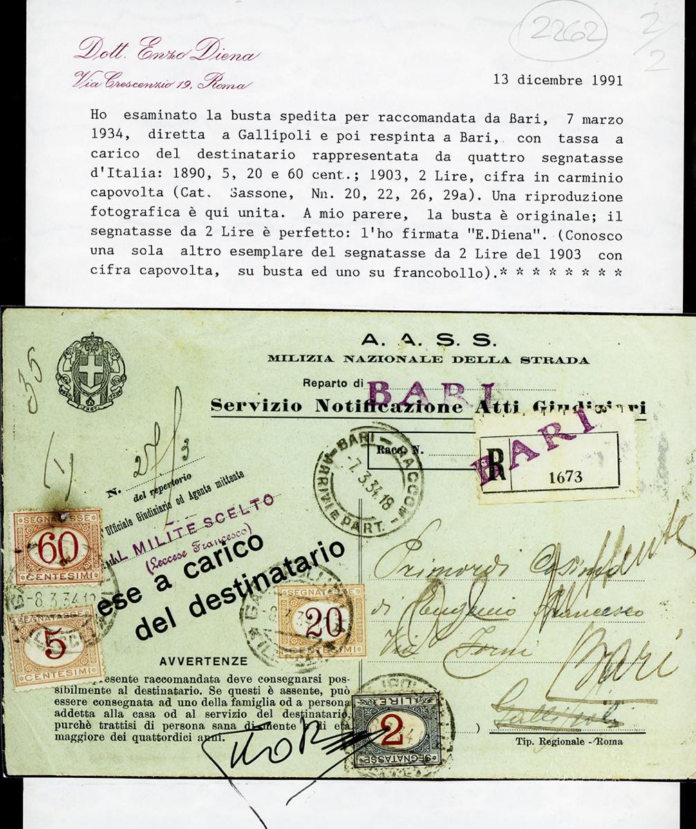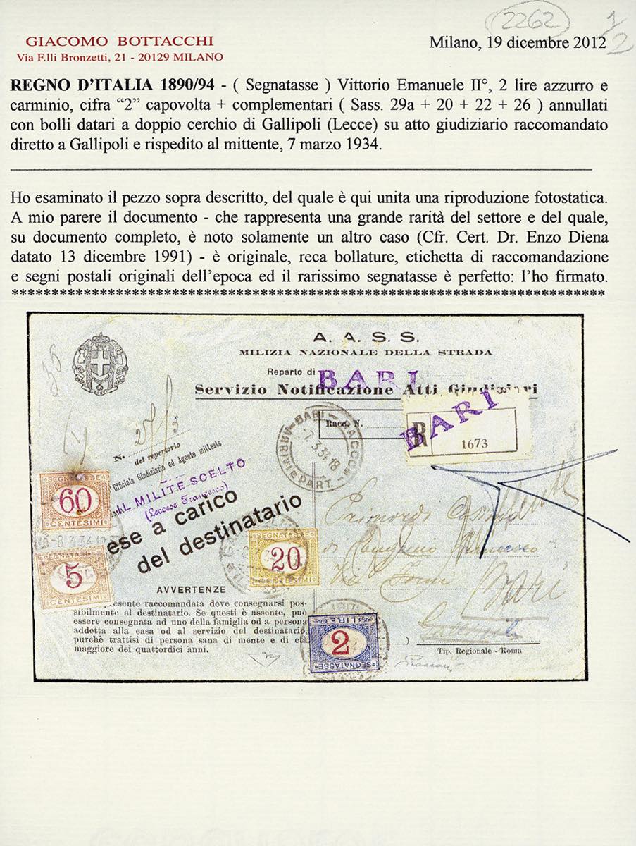 1934 - 2 lire azzurro e carminio, cifra capovolta, perfetto e ben dentellato, 5 cent., 20 cent. e 60 cent., quest'ultimo difettoso (29a,20,22,26), usati in arrivo a Gallipoli su busta raccomandata per notifica di atti giudiziari con tassa a carico del destinatario da Bari 7/3/1934. Varietà estremamente rara su lettera. Una delle due buste conosciute. Bottacchi, cert. E.Diena e Sorani.