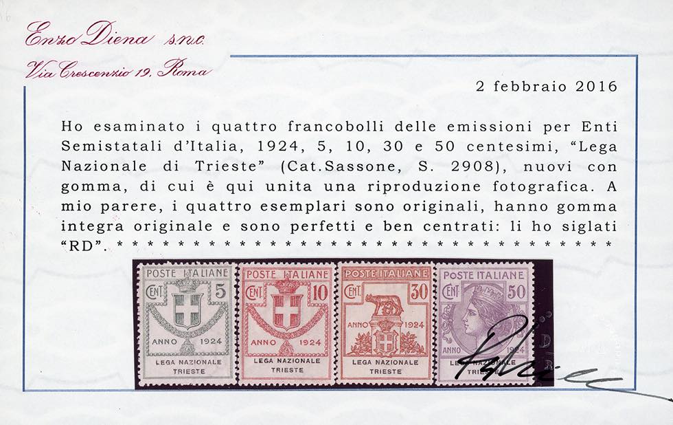 LEGA NAZIONALE TRIESTE 1924 - Serie completa (42/45), ben centrati, gomma originale integra, perfetti. Raybaudi per l'alto valore, cert. Diena per la serie.