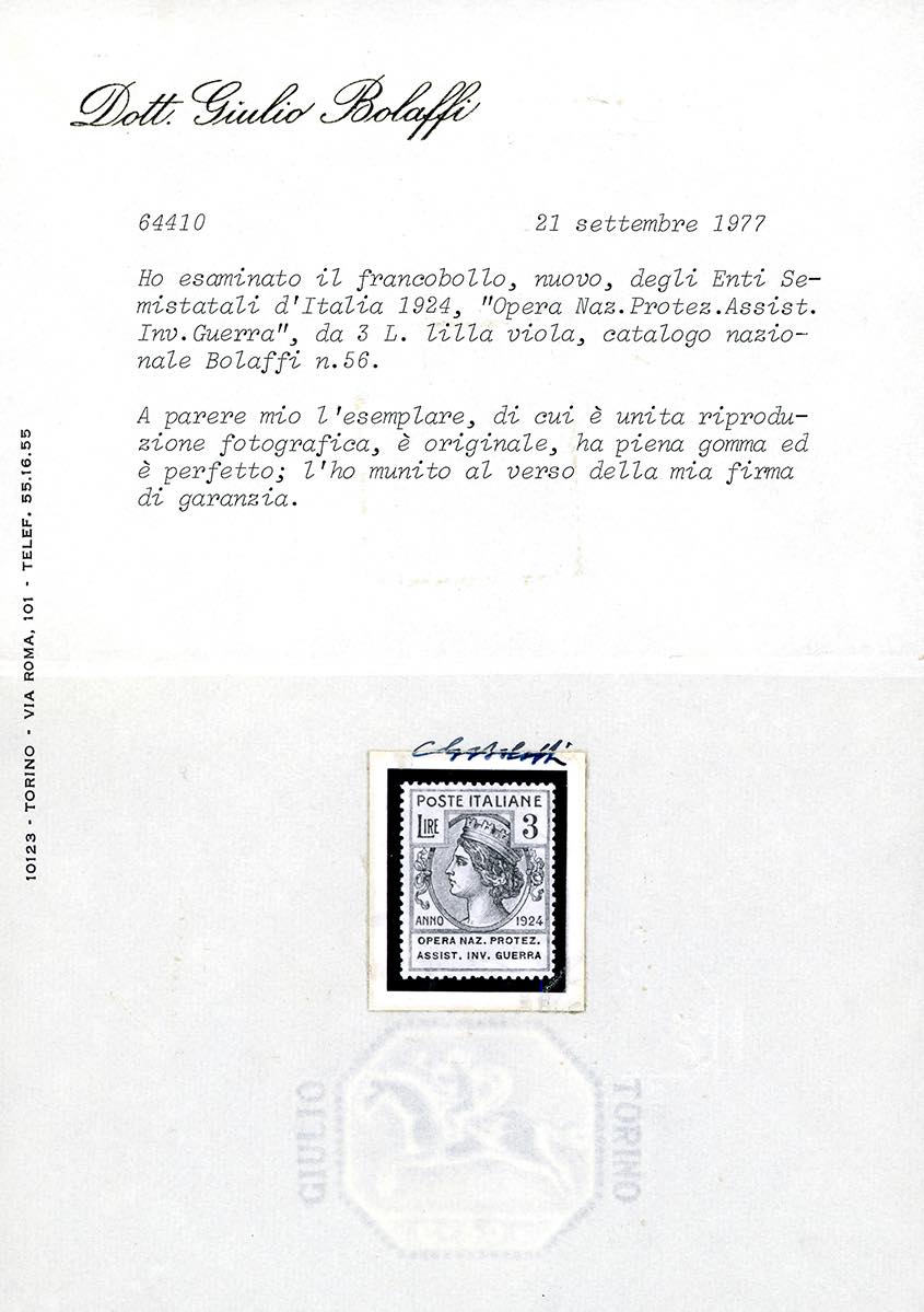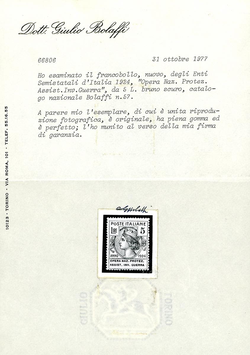 OPERA NAZ. PROTEZ. ASSIST. INV. GUERRA 1924 - Serie completa (50/57), nuovi, gomma originale integra, perfetti e molto freschi. Il 5 lire ben centrato e il 3 lire ottimamente centrato. Rari di questa qualità. Cert. Ferrario e Giulio Bolaffi (cat.Sassone € 69.000/108.000).