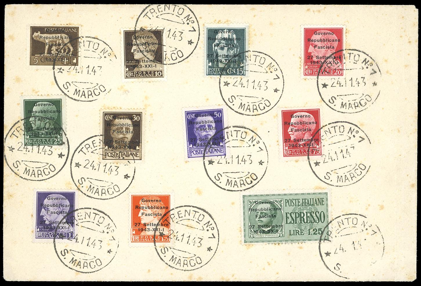 1943 - Undici valori della serie Imperiale soprastampati "Governo Repubblicano Fascista 27 settembre 1943 XXI-I", usati con bollo di Trento 24/11/1943. Non catalogati e da studiare.