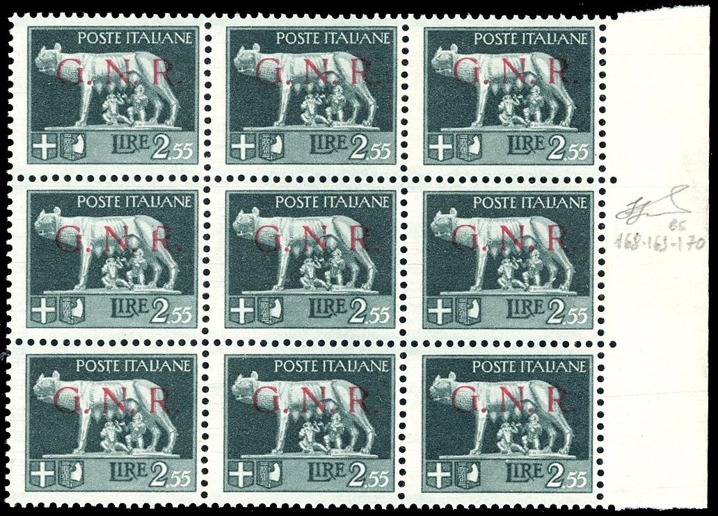 1943 - 2,55 lire, soprastampa G.N.R. di Brescia, I tipo, blocco di nove con al centro la striscia orizzontale di tre posizioni 168-170, il primo esemplare con la "R" scalpellata, il secondo con punto scalpellato dopo la "N", il terzo con punto grosso dopo la "N" (483/I var.non cat, 483/Ioa,483/Ipb), bordo di foglio, nuovo, gomma originale integra, perfetto. Cert. Ferrario.