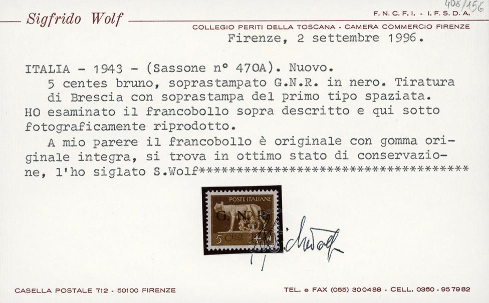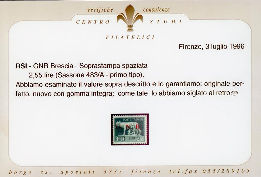 1943 - 5 cent., 2,55 lire e 5 lire, soprastampa G.N.R. di Brescia spaziata del I tipo, serie completa (470/A,483/A,485/A), nuovi, gomma originale integra, perfetti. Il primo firmato Raybaudi e cert. Wolf, il secondo firmato Fiecchi e cert. Raybaudi, il terzo cert. Oro Raybaudi.