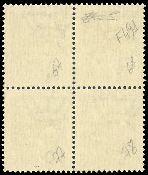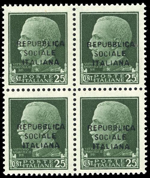 1944 - 25 cent. verde, Imperiale, FALSO DELL'EPOCA, rinvenuto a Genova (F491), eccezionale blocco di quattro, nuovo, gomma originale integra, perfetto. Molto bello e sottoquotato. Fotocopia cert. Raybaudi del blocco di provenienza e cert. Ferrario.
