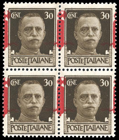 1944 - 30 cent. soprastampa fascio in rosso di Firenze fortemente spostata in senso orizzontale (492/IIpm), blocco di 4, gomma originale integra, perfetto. Chiavarello, cert. Sorani.