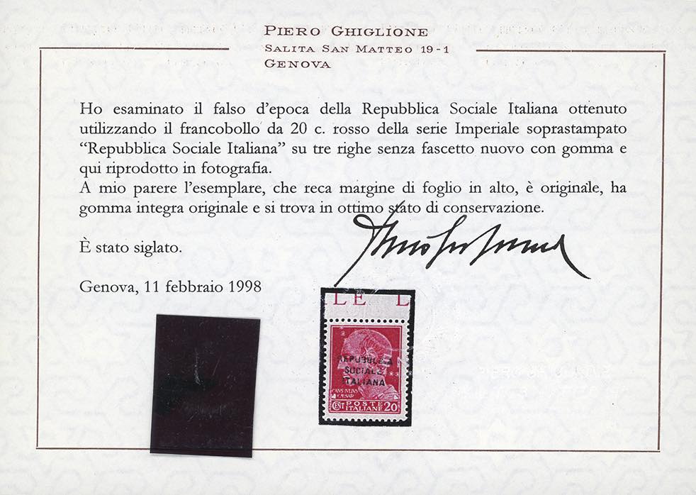 1944 - 20 cent. Imperiale, soprastampato "Repubblica Sociale Italiana" senza fascetto, falso dell'epoca (F495/A), bordo di foglio in alto, gomma originale integra, perfetto. Dei due soli esemplari noti di questo falso, questo è indubbiamente il migliore. Importante rarità del settore. Cert, Ghiglione e Ferrario.