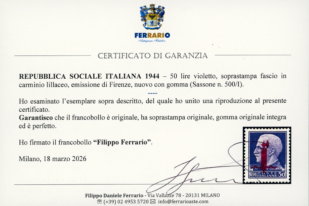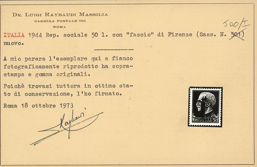 1944 - 50 lire soprastampato fascio in carminio lillaceo, emissione di Firenze (500/I), nuovo, gomma originale integra, perfetto. Fiecchi, Sassone, cert. Raybaudi e Ferrario.