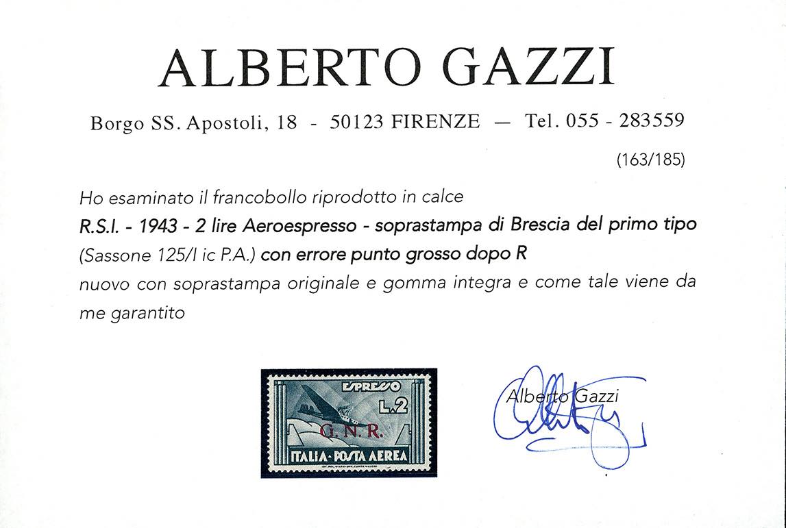 1943 - 2 lire ardesia, soprastampa G.N.R. di Brescia, I tipo, varietà punto grosso dopo "R" (125/ic), nuovo, gomma originale integra, perfetto. UNICO ESEMPLARE NOTO. Raybaudi, cert. Gazzi e Ferrario.