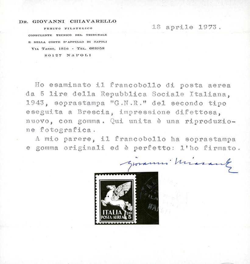 1943 - 5 lire, soprastampa G.N.R. di Brescia, II tipo, varietà "N" incompleta (123/Iial), nuovo, gomma originale, leggera traccia di linguella, perfetto. Molto raro, si tratta probabilmente dell'esemplare che presenta questa varietà in maniera più evidente. G.Oliva, Ferrario, cert. Raybaudi e Chiavarello.