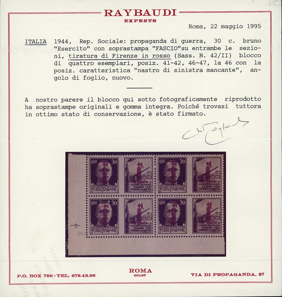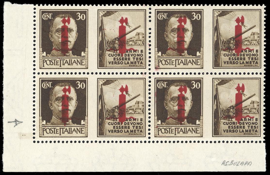 1944 - 30 cent. Esercito, soprastampa fascio su entrambe le sezioni in rosso, tiratura di Firenze, blocco di quattro, l'esemplare in posiz. 46 con la varietà caratteristica "nastro di sinistra mancante/spezzato" (42/IId+42/II), angolo di foglio, nuovo, gomma originale integra, perfetto. Grande rarità del settore, insieme unico. Cert. Raybaudi.