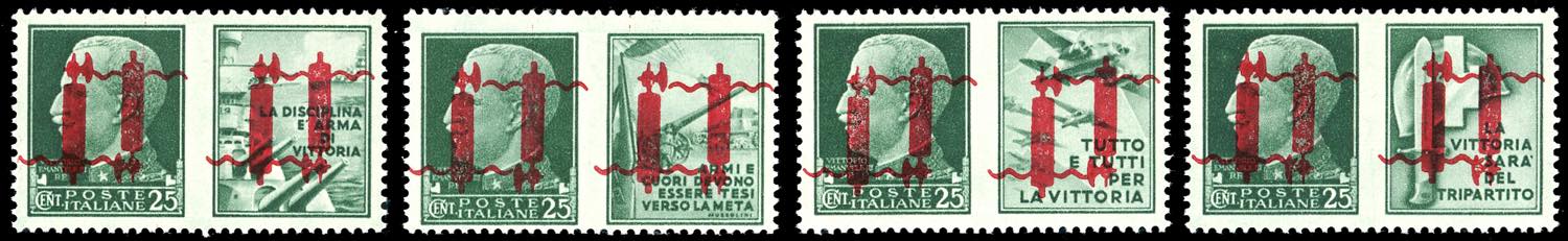 1944 - 25 cent. soprastampati su entrambe le sezioni, tiratura di Verona, i quattro valori con doppia soprastampa di cui una capovolta ... Leggi tutto