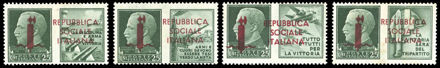 PROPAGANDA DI GUERRA 1944 - Soprastampa di prova in rosso, serie completa (P1/P4), nuovi, gomma originale, leggeri ingiallimenti. Sorani, ... Leggi tutto