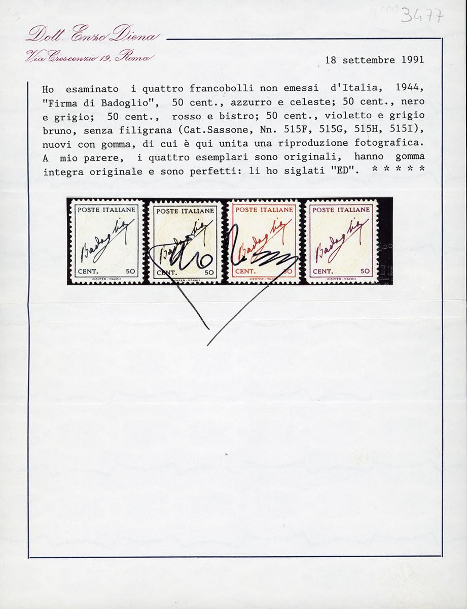 1944 - Badoglio, senza filigrana, serie completa (515F/515I), nuovi, gomma originale integra, perfetti. Molto rari e splendidi. A.Diena, cert. Enzo Diena 1991.
