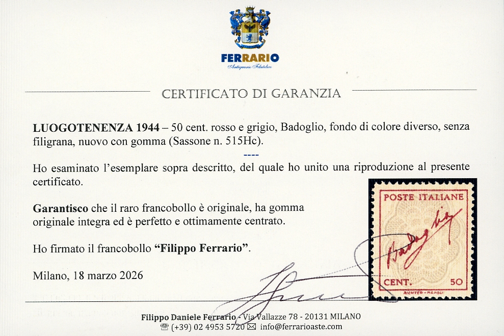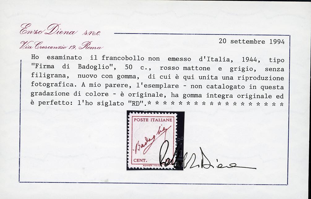 1944 - 50 cent. rosso e grigio, Badoglio, FONDO DI COLORE DIVERSO, senza filigrana (515Hc), nuovo, gomma originale integra, perfetto e ottimamente centrato. Rarissimo, pochissimi esemplari esistenti. A.Diena, Enzo Diena, cert. Diena e Ferrario.