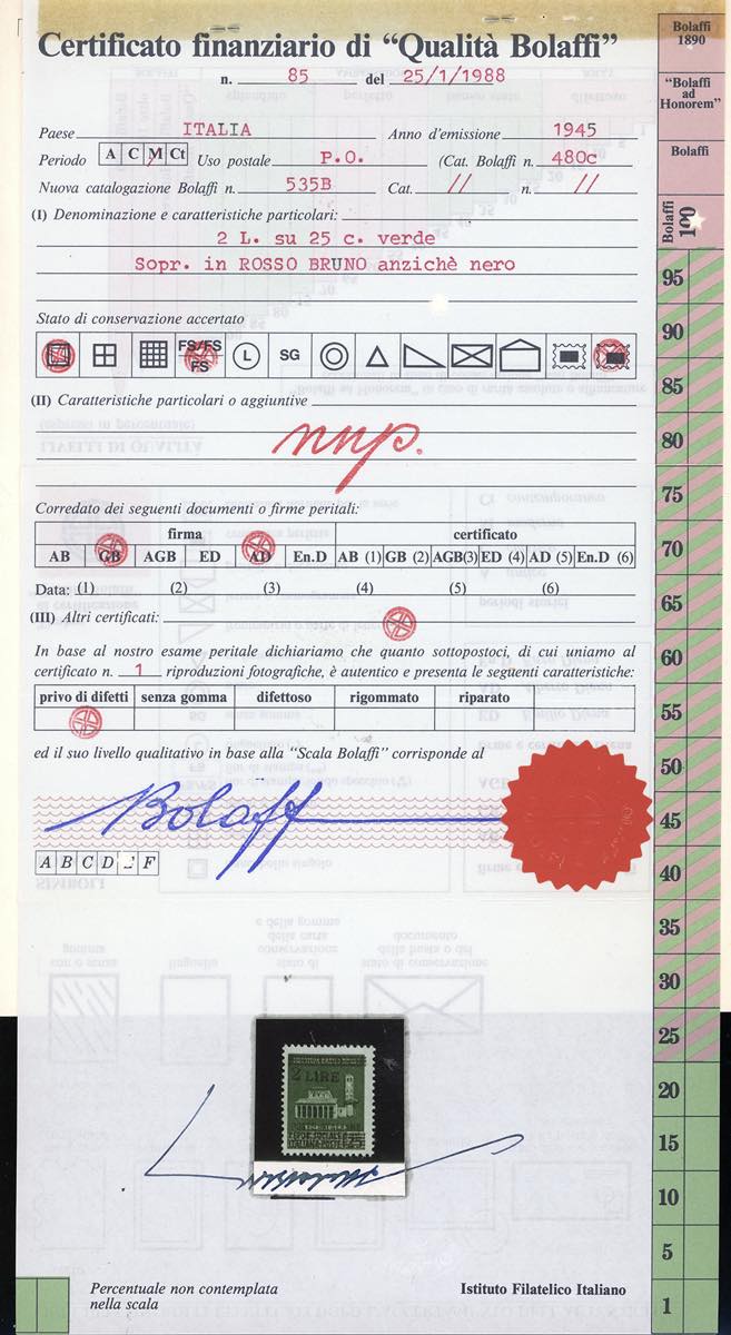 1945 - 2 lire su 25 cent., soprastampa rosso bruno (525A), nuovo, gomma originale integra, perfetto. G.Bolaffi, A.Diena, cert. finanziario ... Leggi tutto