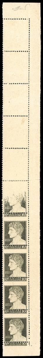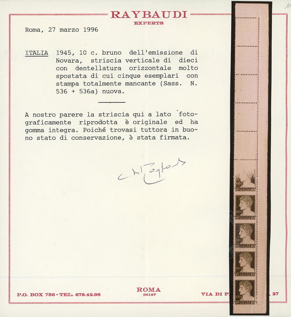 1945 - 10 cent. Imperiale, emissione di Verona, striscia verticale di 10 esemplari, di cui cinque con stampa totalmente mancante, uno con stampa incompleta, gli altri stampati normalmente, dentellatura orizzontale fortemente sopstata in alto (536aba), angolo di foglio, nuova, gomma originale integra, linguella al centro per rinforzare la dentellatura, perfetti, alcuni esempalri con dentellatura leggermente aperta. Rara. Ferrario, cert. Raybaudi.
