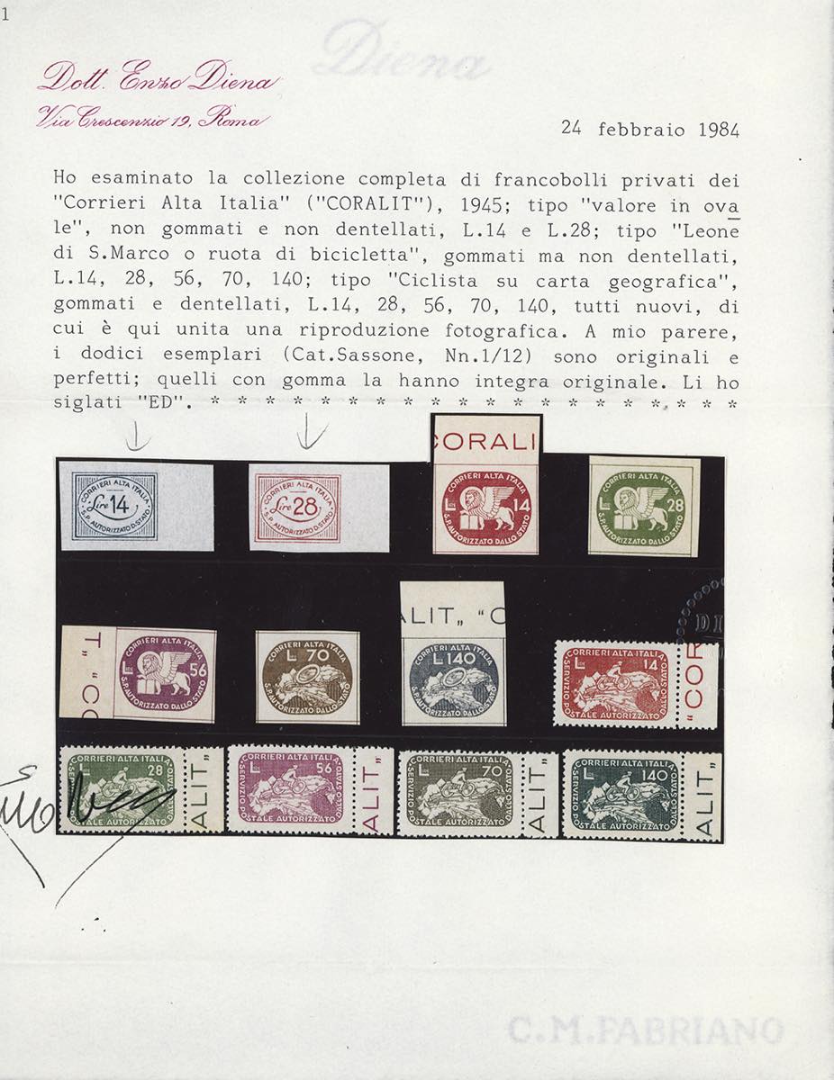 CORALIT 1945 - Cifra in un ovale, serie completa (1/2), bordo di foglio, nuovi, senza gomma come sempre, perfetti. Molto belli. Ferrario, cert. Diena.