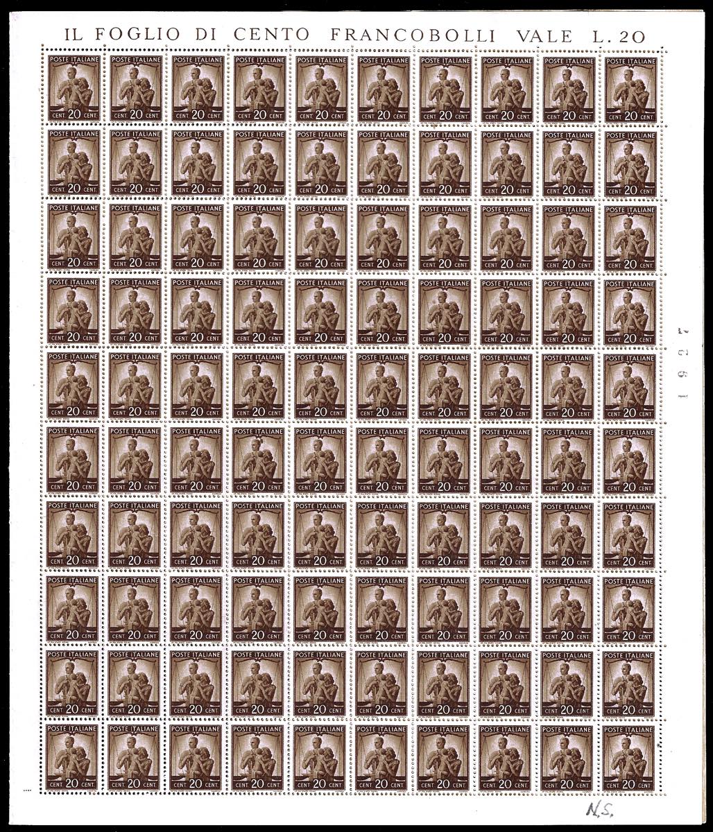 Lotto 1396 - 1945 - 20 cent. Democratica (544), foglio completo di 200 ...