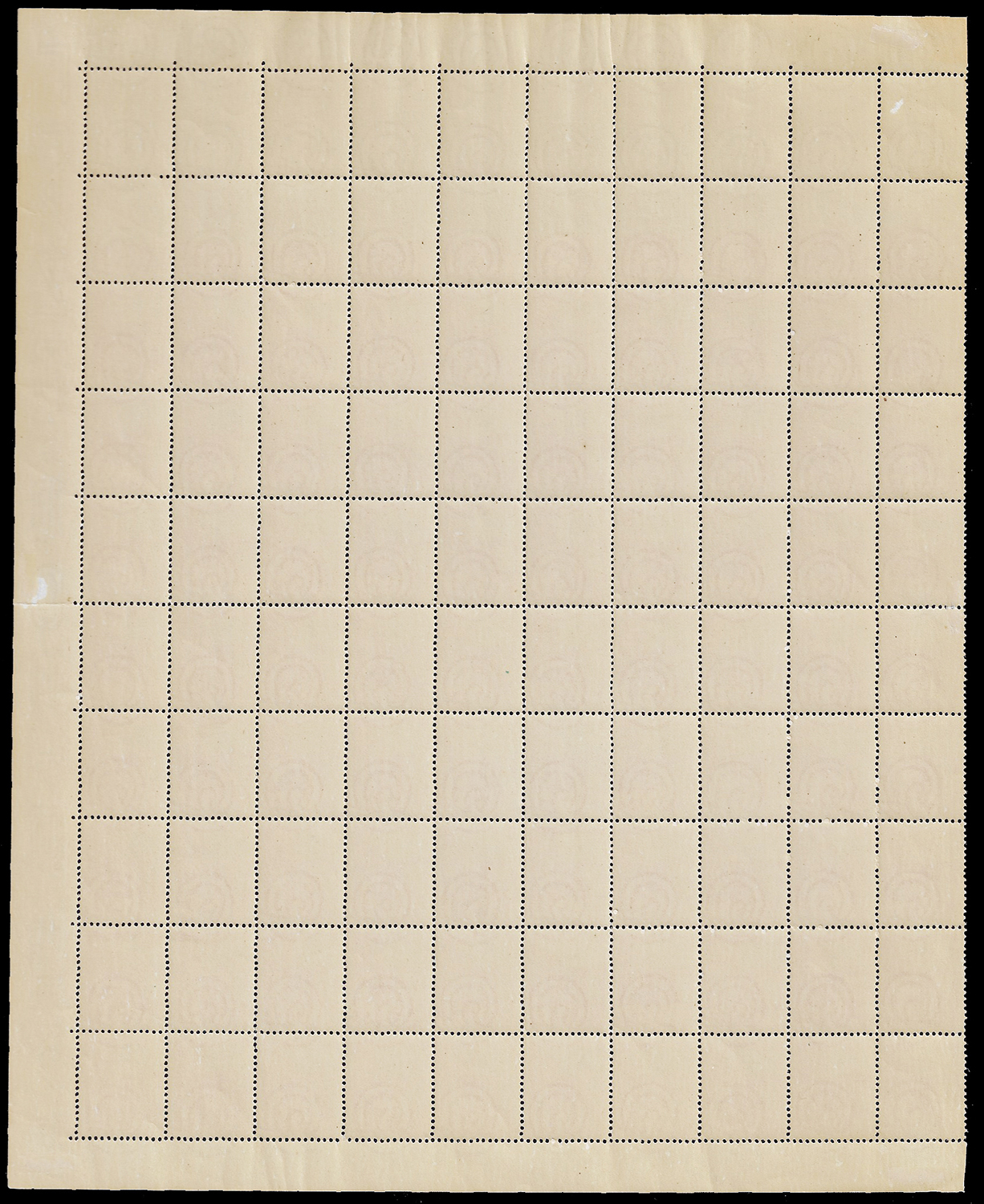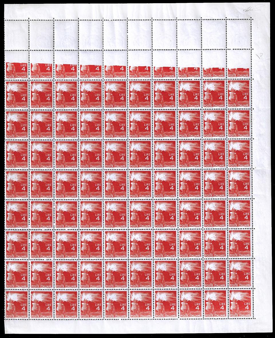1945 - 4 lire Democratica, foglio completo di 100 esemplari, stampa totalmente mancante sui 10 francobolli della prima riga e incompleta su tutti quelli della seconda riga (554 varietà non catalogata per questo valore, 554g nota), gomma originale integra, perfetto. Varietà inedita per il 4 lire, insieme estremamente raro. Ferrario, cert. E.Diena.