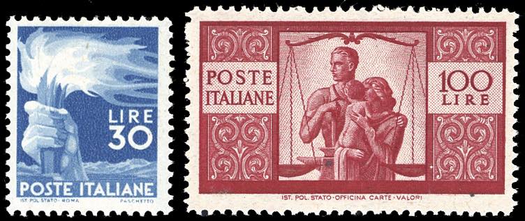 Lotto 1409 - 1946/47 - 30 e 100 lire Democratica (563,565), nuovi, gomma ...