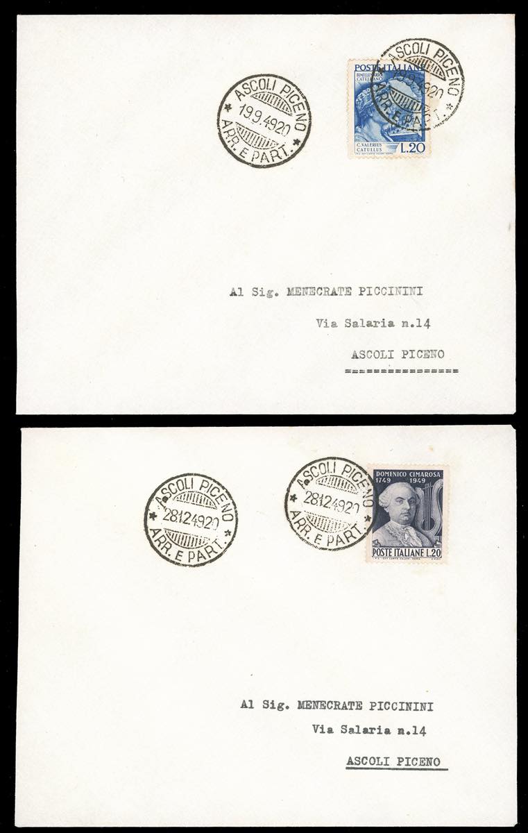 1949 - Collezione completa dell'annata dei francobolli di posta ordinaria, usati su busta con annullo del primo giorno d'emissione. La serie ERP e 20 lire Mazzini, non conteggiati, sono stati annullati il giorno successivo. Il 20 lire Alfieri è stato eccezionalmente annullato il giorno precedente all'emissione. Insieme non comune, qualità eccellente.
