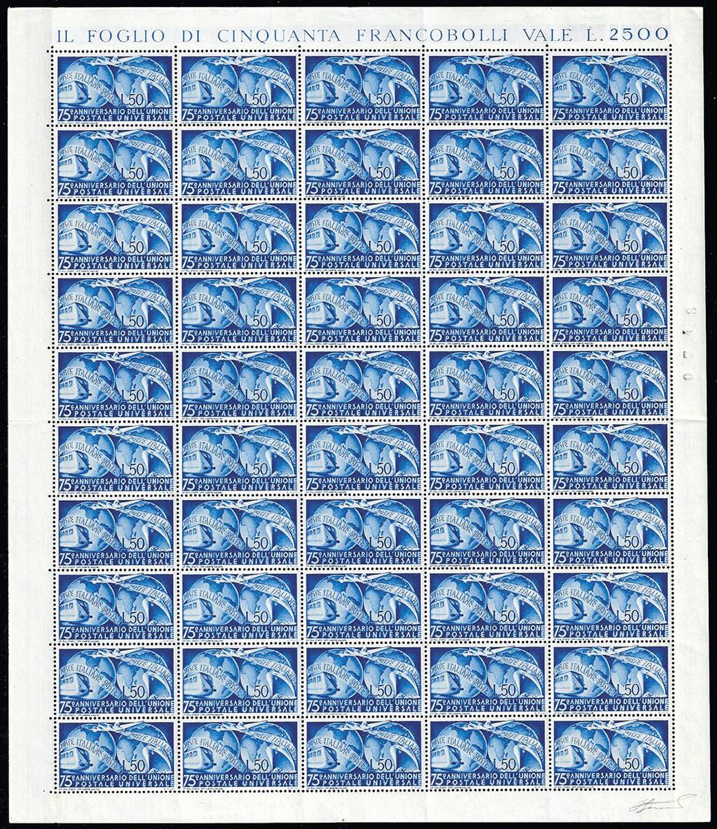1949 - 50 lire U.P.U. (599), foglio nuovo di 50 esemplari, gomma originale integra, perfetto e ben centrato. Molto bello. Ferrario.