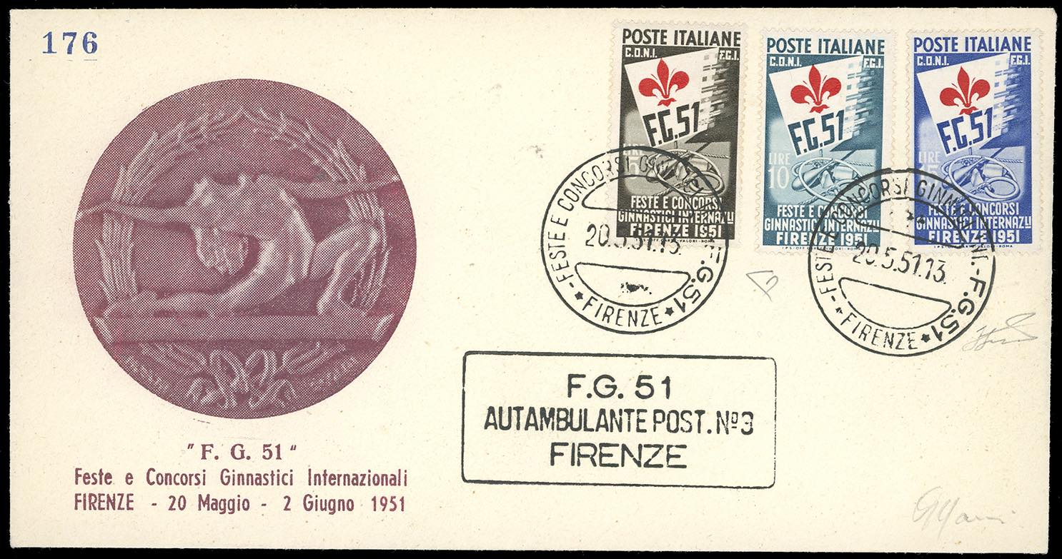 1951 - Ginnici, serie completa (661/663), perfetti, su busta della Manifestazione non viaggiata, con annullo speciale del 20/5/1951. ... Leggi tutto