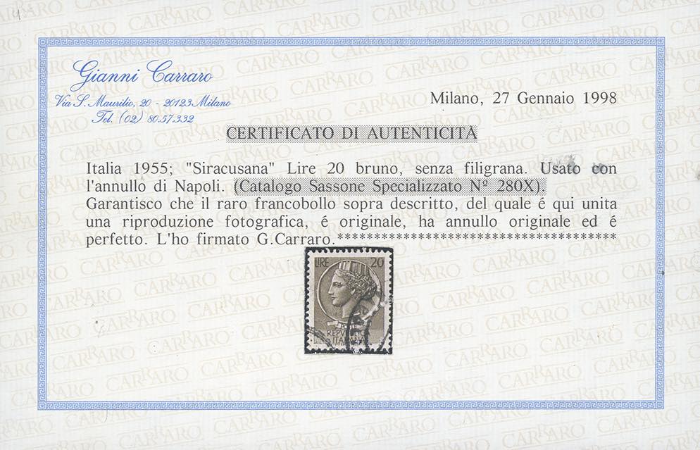 1955 - 20 lire Siracusana, senza filigrana (768a), perfetto, usato a Napoli. Molto raro. Cert. Carraro.