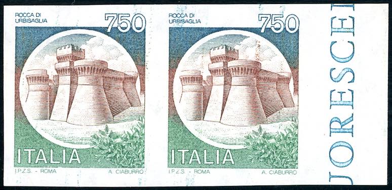 1990 - 750 lire Castelli, coppia orizzontale non dentellata (1524Ae), bordo di foglio, gomma originale integra, perfetta. Ferrario.