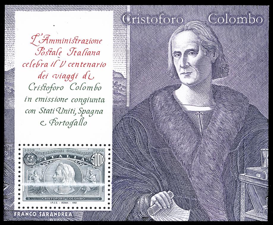 1992 - 5.000 lire Colombo, foglietto (15), il francobollo con un'interessante varietà di stampa "secca", con il rilievo della stampa ... Leggi tutto