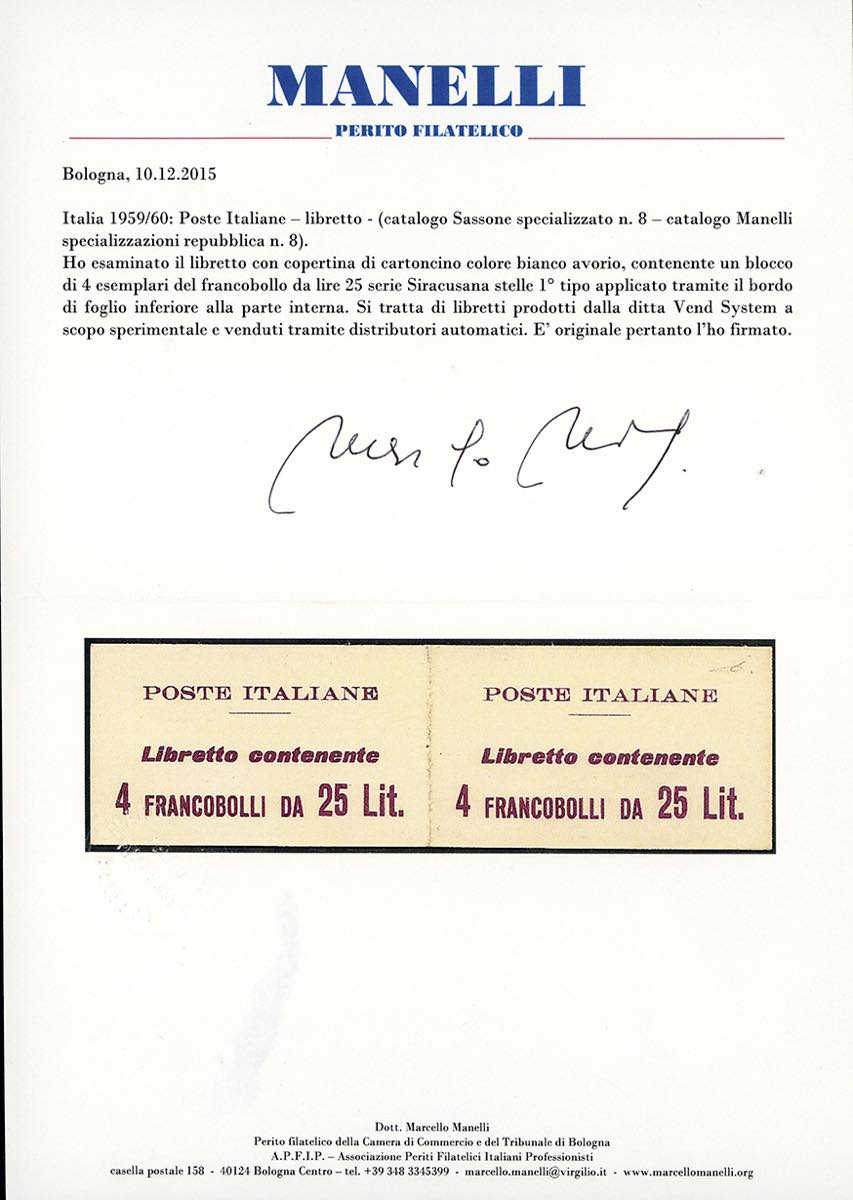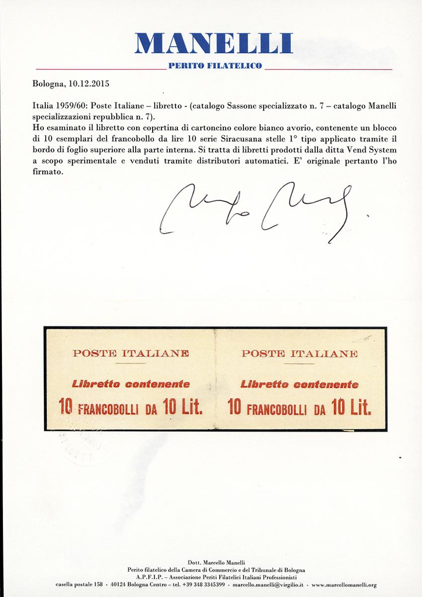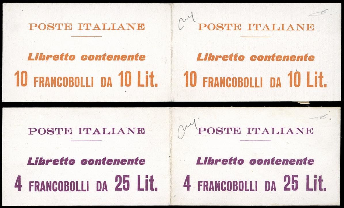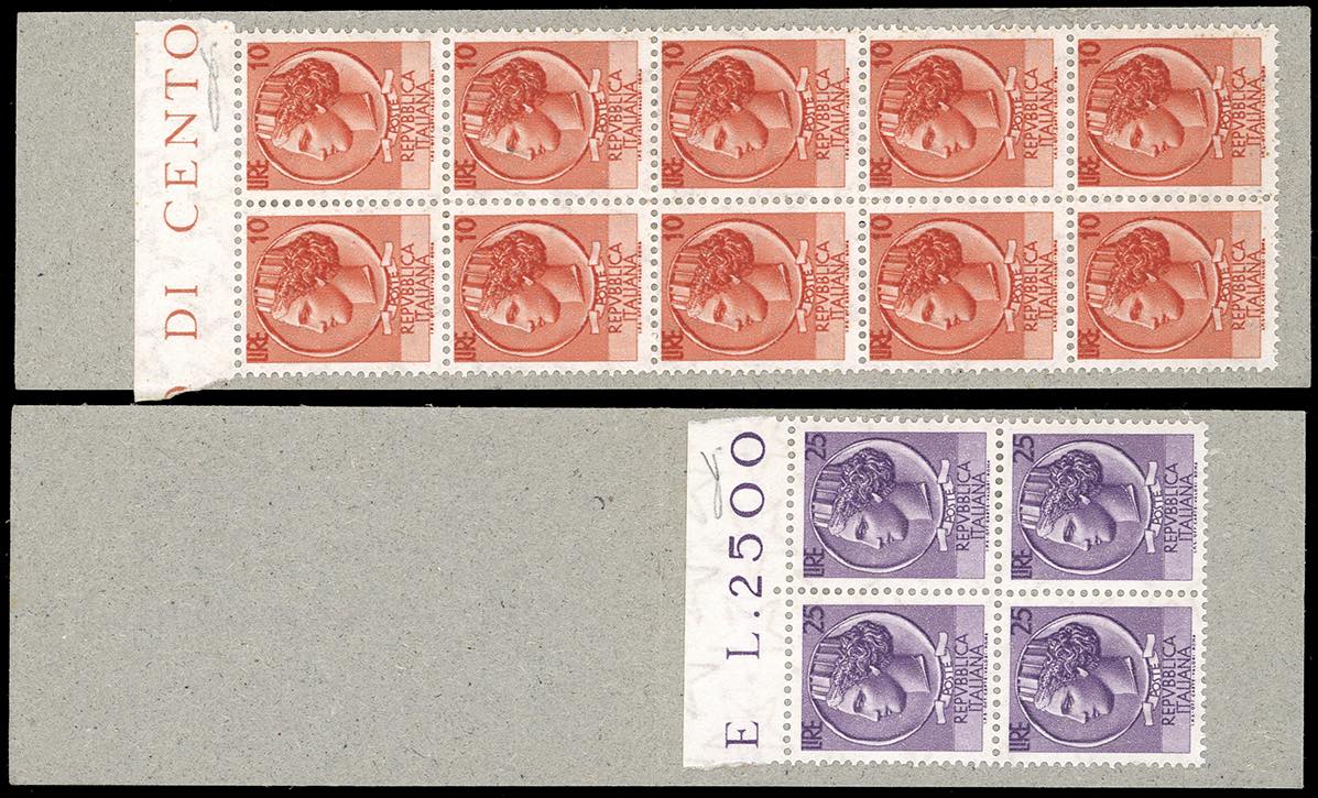 1959/60 - Due libretti Poste Italiane, un esemplare con copertina bianca e scritte in arancione, cifre "10" dello stesse carattere, contenente 10 esemplari da 10 lire Siracusana, l'altro con copertina bianca e scritte in lilla, contenente 4 esemplari da 25 lire Siracusana (10A,11), nuovi, gomma originale integra, perfetti. Rari. Cert. Manelli.