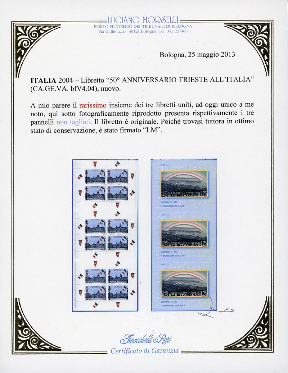 2004 - Libretto Trieste all'Italia (26), tre esemplari con le copertine ancora unite e non tagliate, completi di francobolli, nuovi, gomma originale integra, perfetti. Insieme molto raro. Cert. Morselli.