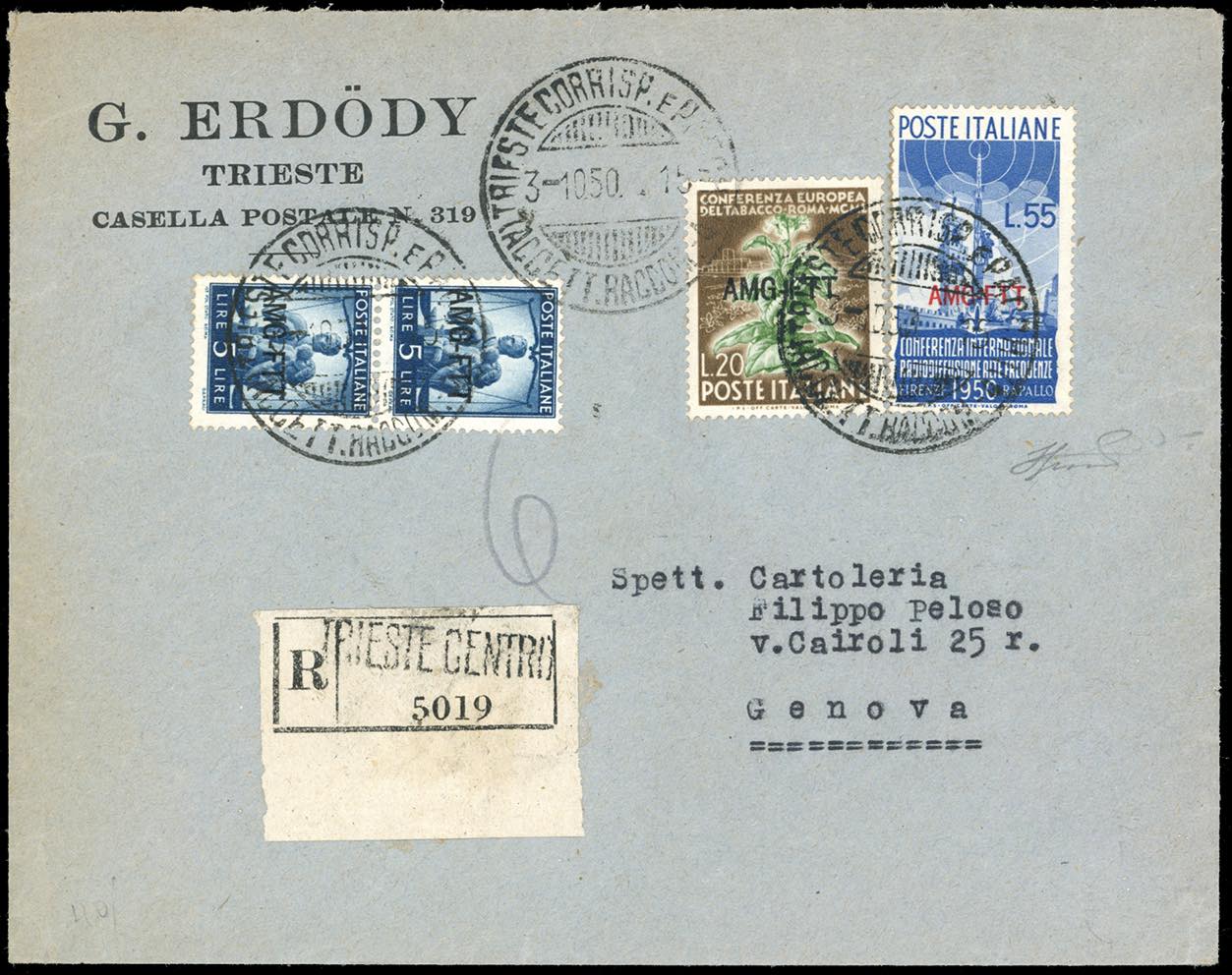 1950 - 55 lire Radiodiffusione, 20 lire Tabacco, 5 lire Democratica, coppia (77,85,59), perfetti, su busta raccomandata da Trieste 3/10/1950 a Genova, bollo d'arrivo. Rara lettera non filatelica in perfetta tariffa con il 55 lire Radiodiffusione. Ferrario.