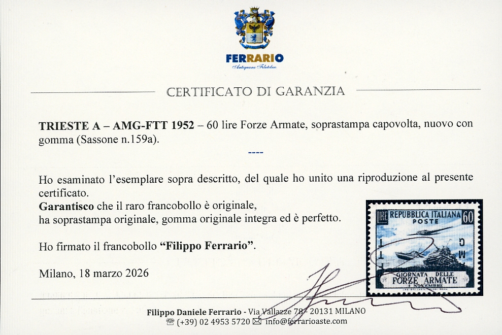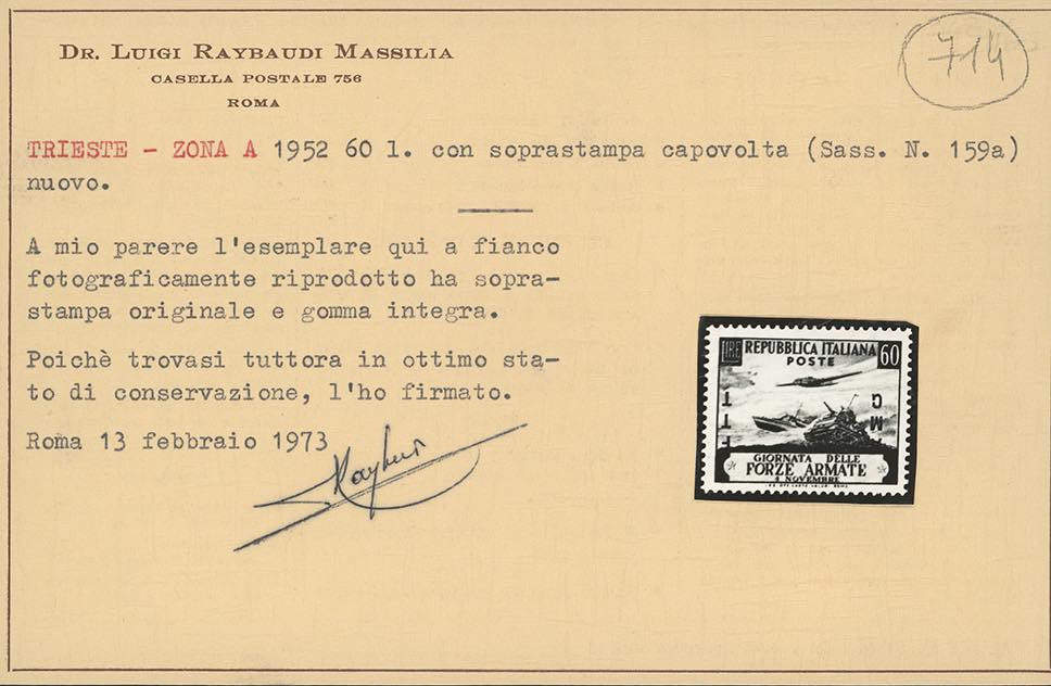 1952 - 60 lire Forze Armate, soprastampa capovolta (159a), nuovo, gomma originale integra, perfetto. Raro. R.Mondolfo, cert. Raybaudi.