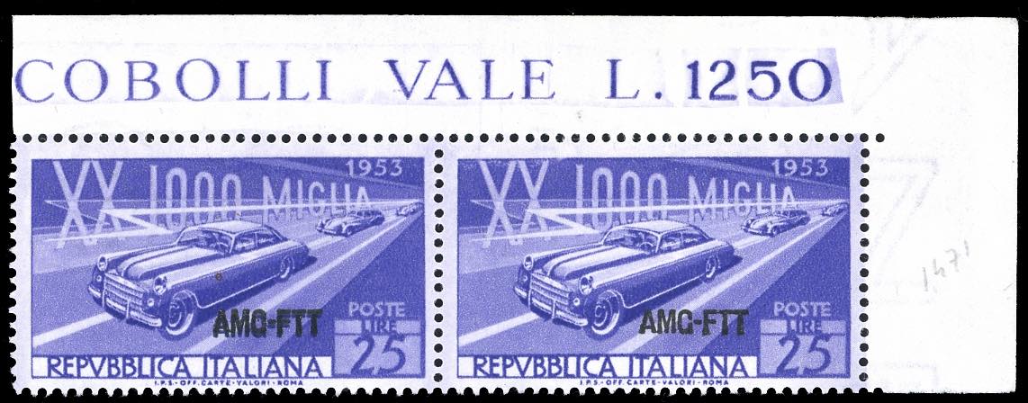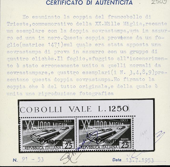 1953 - 25 lire Mille Miglia, doppia soprastampa, nera + azzurra, in coppia con il normale (165c), angolo di foglio, nuovo, gomma originale integra, perfetto. La coppia proviene da un foglio sul quale era stata apposta una soprastampa di prova in azzurro con un gruppo di quattro clichè. Il foglio, sfuggito all'incenerimento, è stato erroneamente unito a quelli normali da soprastampare e quattro esemplari (alle posiz.3,4,8,9), presentano la doppia soprastampa bicolore. Varietà di grande interesse e di estrema rarità. Quattro esemplari noti. Alberto Diena e cert. R.Mondolfo.