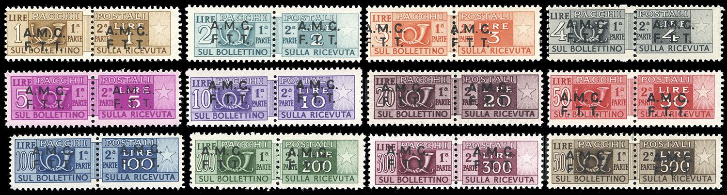 PACCHI POSTALI 1947/48 - Soprastampati su due righe, serie completa (1/12), nuovi, gomma originale integra, perfetti. Cert. Ferrario per i tre alti valori.