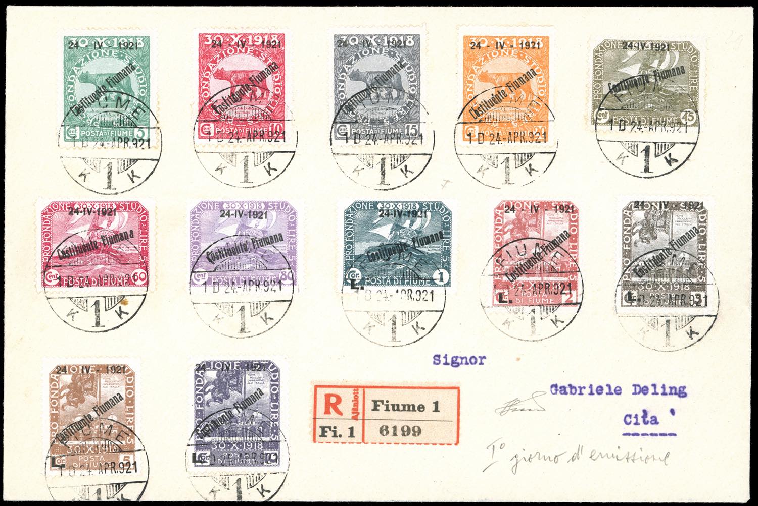 FIUME 1921 - Soprastampati "Costituente Fiumana", serie completa (164/175), perfetti, usati su busta raccomandata da Fiume 24/4/1921, PRIMO GIORNO D'EMISSIONE, per città. Ferrario.