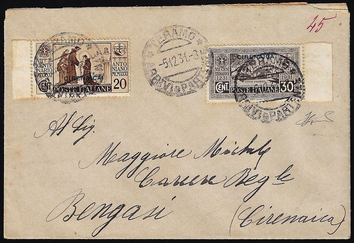 1931 - 20 cent., 30 cent. S.Antonio (86,88), bordo di foglio, perfetti, su busta da Teramo 5/12/1931 a Bengasi. Raro uso in territorio Italiano! Ferrario.