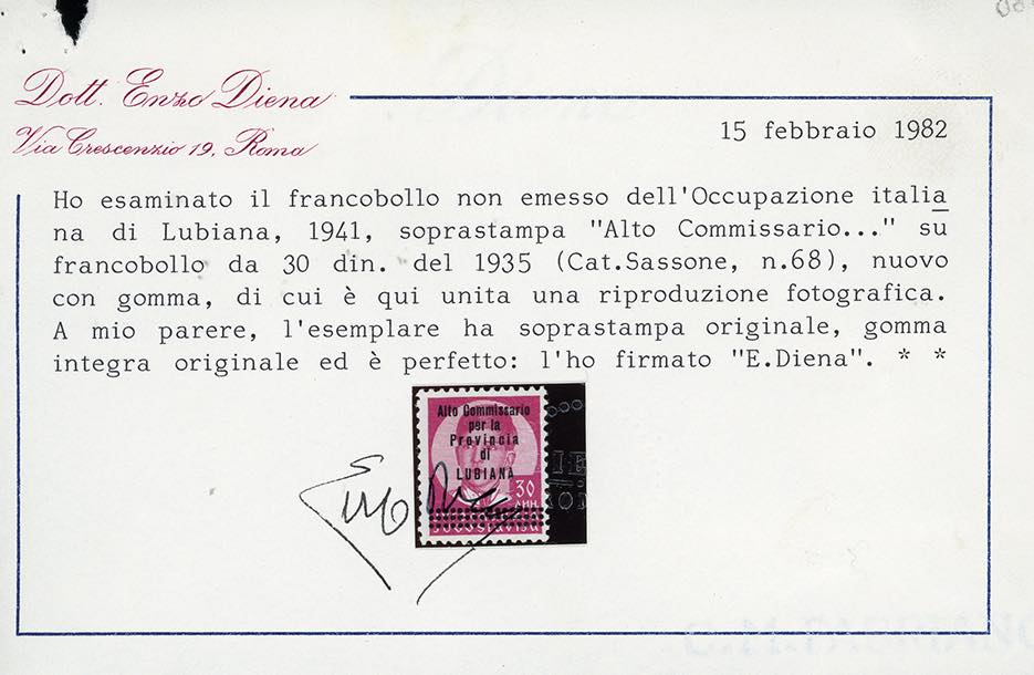 LUBIANA 1941 - 30 d. soprastampato "Alto Commissario per la Provincia di Lubiana", non emesso (68), nuovo, gomma originale integra, perfetto e di ottima qualità. Estremamente raro, solo 17 esemplari noti. A.Diena, cert. E.Diena e Oro Raybaudi.