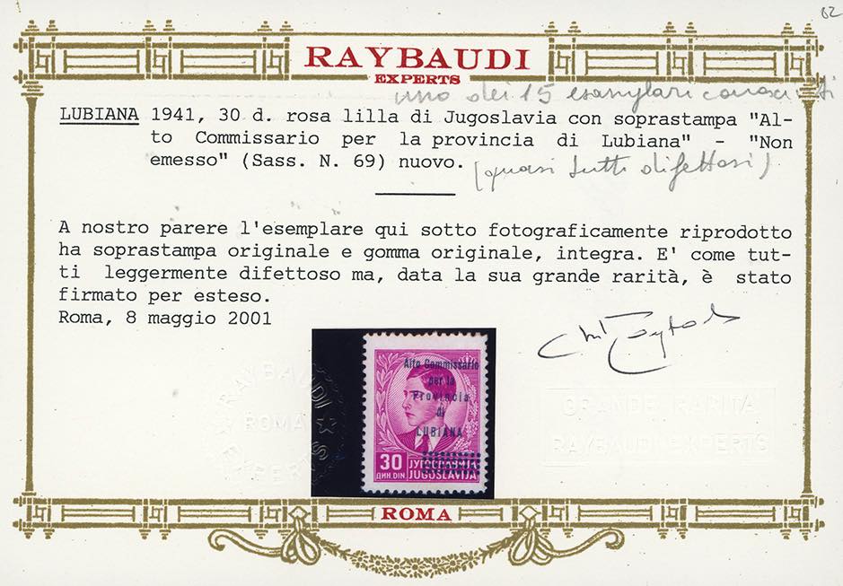 LUBIANA 1941 - 30 d. soprastampato "Alto Commissario per la Provincia di Lubiana", non emesso (69), nuovo, gomma originale integra, leggermente difettoso come quasi tutti i soli 15 esemplari noti, ottimo aspetto. Grande rarità delle Occupazioni italiane della II Guerra Mondiale. Quotazione di catalogo come difettoso. Cert. Oro Raybaudi.
