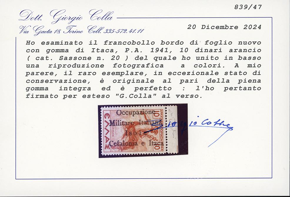 CEFALONIA E ITACA-EMISSIONI DI ITACA 1941 - 10 d. arancio posta aerea soprastampato, "O " di "Occupazione" maiuscola (A20), nuovo, gomma ... Leggi tutto